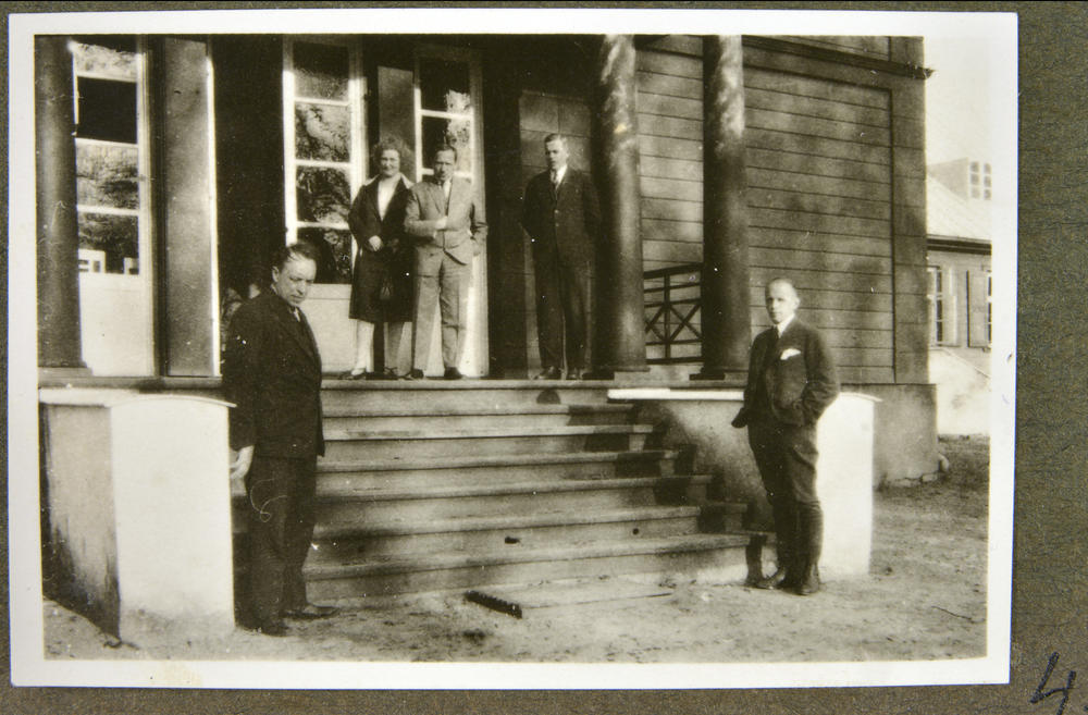 Vecā Kalnamuižas sanatorija Tērvetē. Pie durvīm, centrā sanatorijas vadītājs Eižens Puriņš. Kalnamuižā, 1900. gadā celtajā grāfa Pētera fon der Pālena medību muižā, 1924. gadā