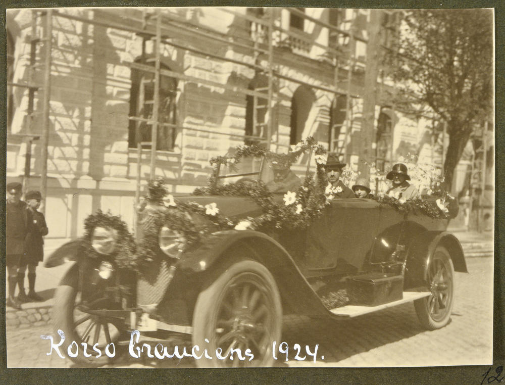 Skats uz ''Baltās puķes'' dienas korso brauciena (ar ziediem rotātu ratu, automašīnu rinda) dalībniekiem. Latvijas Tuberkulozes apkarošanas biedrība "Baltās puķes" dienas labdarības pasākumā vāca līdzekļus ar tuberkulozi slimu cilvēku ārstēšanai.