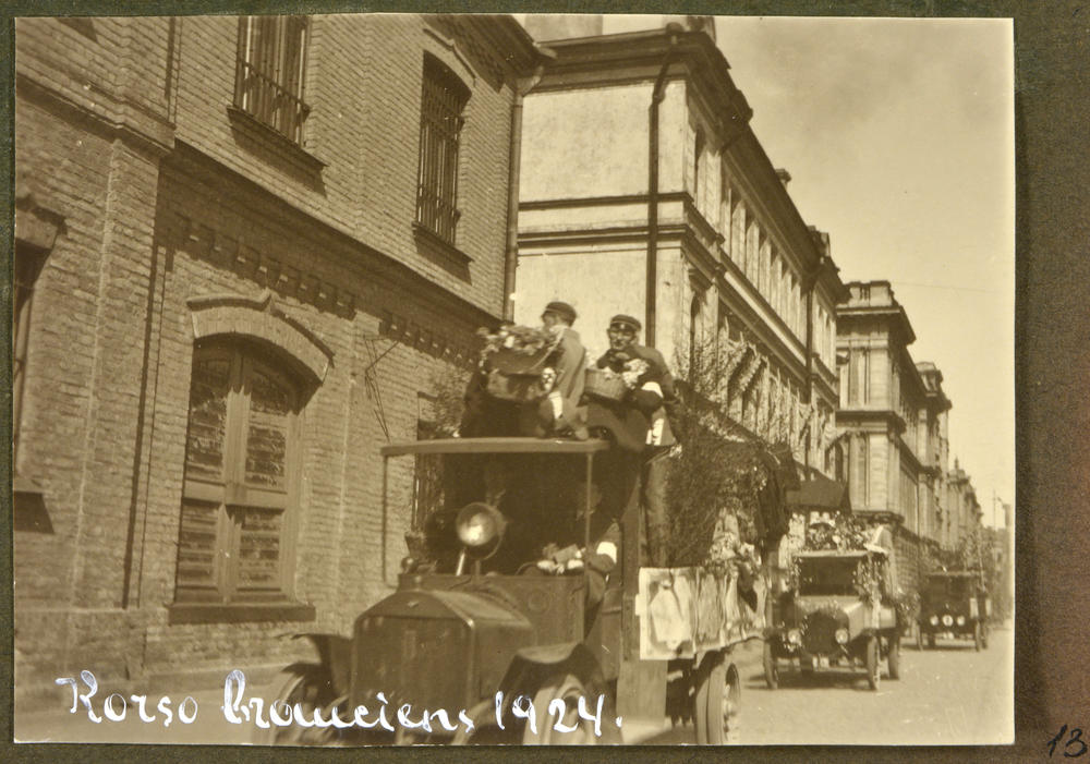 Skats uz pirmās ''Baltās puķes'' dienas korso braucienu (ar ziediem rotātu ratu, automašīnu rinda). Latvijas Tuberkulozes apkarošanas biedrība "Baltās puķes" dienas labdarības pasākumā vāca līdzekļus ar tuberkulozi slimu cilvēku ārstēšanai.