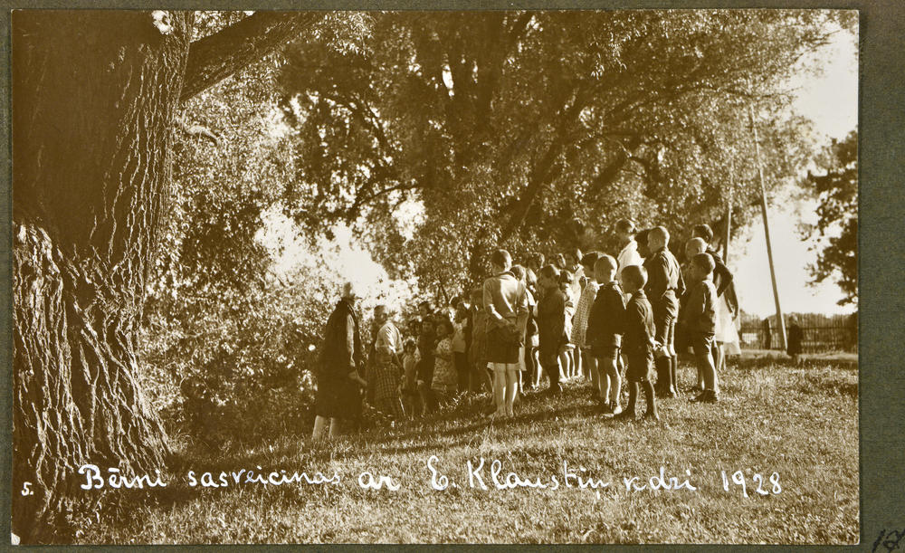 Bērni zem koku zariem sagaida, sasveicinās ar literāti, sabiedrisko darbinieci, Latvijas Tuberkulozes apkarošanas biedrības priekšsēdētāju Elzu Klaustiņu.