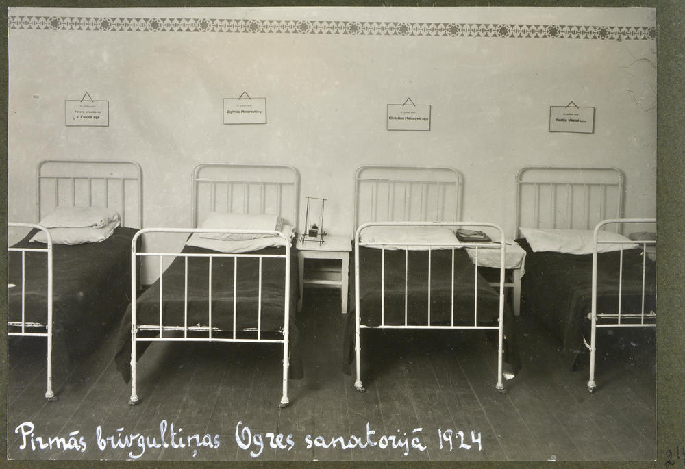 Latvijas Tuberkulozes apkarošanas biedrības 1924. gadā atklātās pirmās bērnu sanatorijas Ogres Grīvas muižā palāta ar gultiņām bērniem, kas ārstējās bez maksas. (Arī Ogresgrīvas pusmuiža, tagad Rīgas ielā 14, Ogrē).