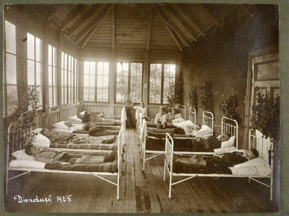 Latvijas Tuberkulozes apkarošanas biedrības 1924. gadā atklātās pirmās bērnu sanatorijas Ogres Grīvas muižas palātā zēni "klusajā stundā" guļ diendusu. (Arī Ogresgrīvas pusmuiža, tagad Rīgas ielā 14, Ogrē).