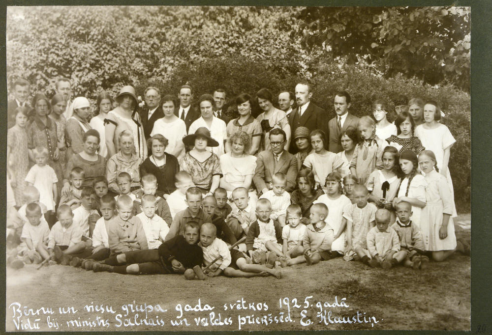 Latvijas Tuberkulozes apkarošanas biedrības 1924. gadā atklātās bērnu sanatorijas Ogres Grīvas muižā bērni un viesi dibināšanas gada svētkos sanatorijas dārzā. Grupas foto. Centrā Latvijas Tuberkulozes apkarošanas biedrības priekšsēdētāja Elza Klaustiņa un Latvijas darba ministrs Voldemārs Salnais.