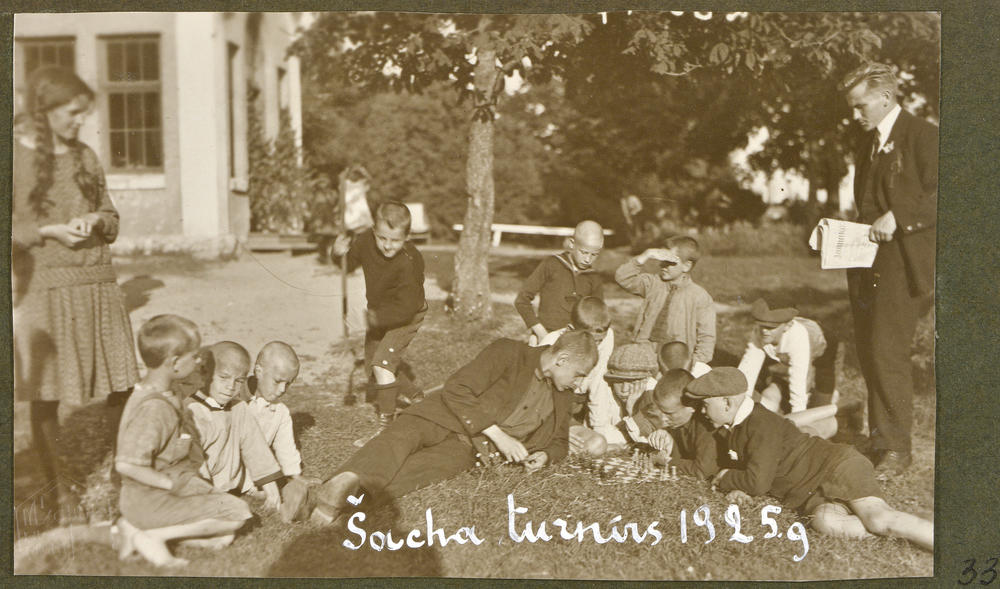 Latvijas Tuberkulozes apkarošanas biedrības 1924. gadā atklātajā pirmajā bērnu sanatorijā Ogres Grīvas muižā bērni spēlē šahu. (Arī Ogresgrīvas pusmuiža, tagad Rīgas ielā 14, Ogrē).