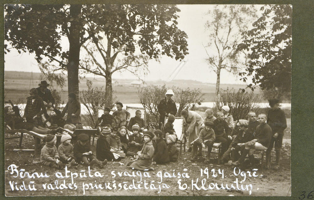 Latvijas Tuberkulozes apkarošanas biedrības 1924. gadā atklātās bērnu sanatorijas Ogres Grīvas muižā bērni atpūtas laikā svaigā un Latvijas Tuberkulozes apkarošanas biedrības priekšsēdētāja Elza Klaustiņa (centrā) pie upes. Grupas foto.