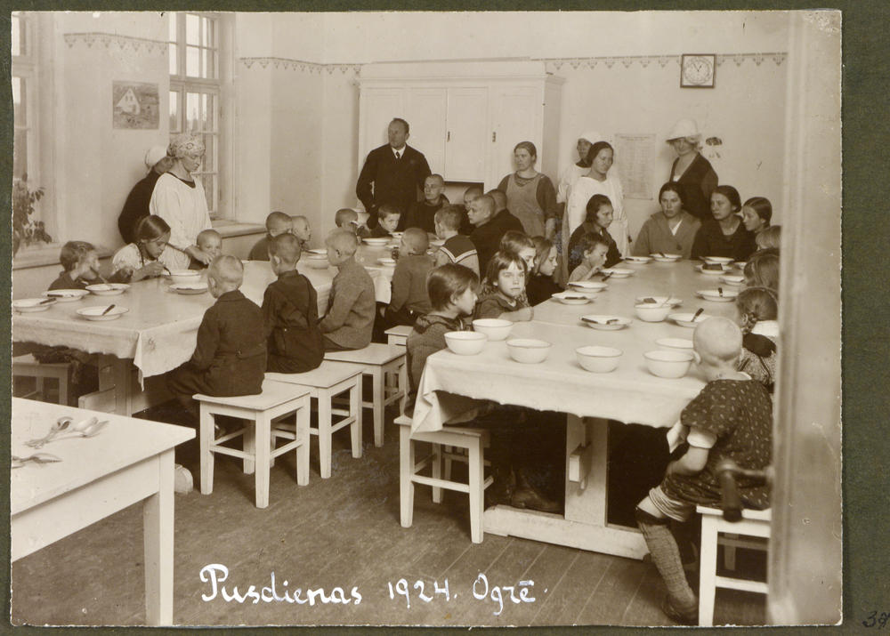 Latvijas Tuberkulozes apkarošanas biedrības 1924. gadā atklātajā bērnu sanatorijā Ogres Grīvas muižā bērni pie galda ēd pusdienas.
