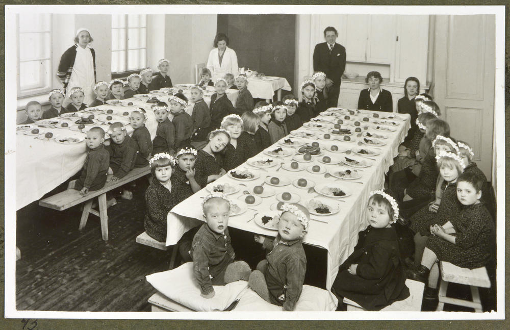 Latvijas Tuberkulozes apkarošanas biedrības 1924. gadā atklātajā bērnu sanatorijā Ogres Grīvas muižā bērni ar margrietiņu vainadziņiem galvā un darbinieki pie svētku mielasta galdiem. (Arī Ogresgrīvas pusmuiža, tagad Rīgas ielā 14, Ogrē).