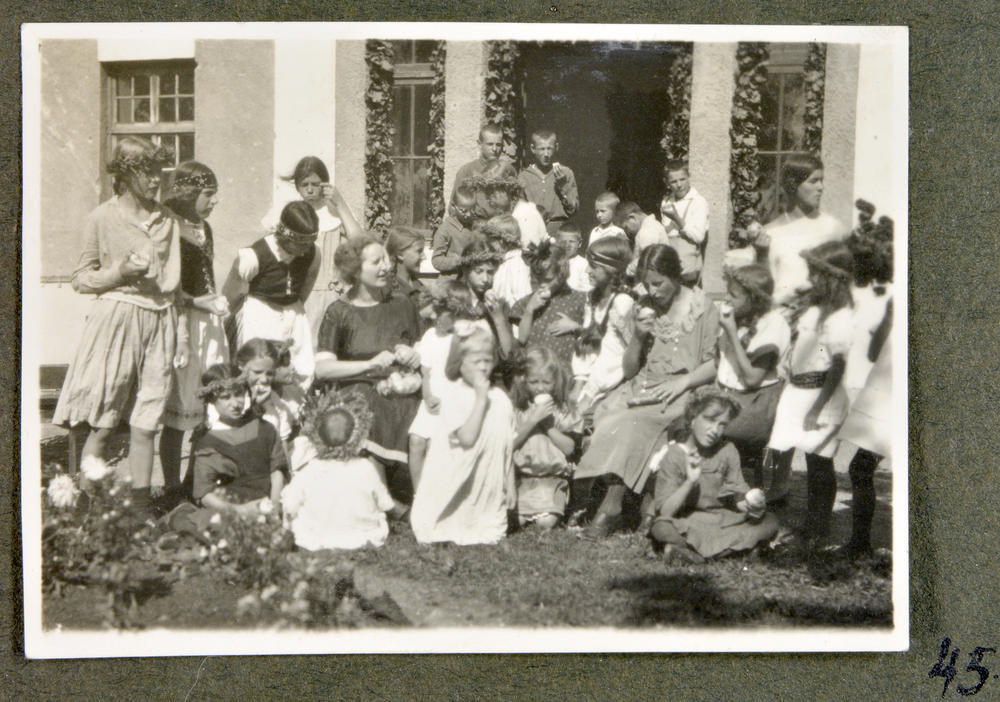 Latvijas Tuberkulozes apkarošanas biedrības 1924. gadā atklātās bērnu sanatorijas Ogres Grīvas muižā bērni svētku laikā pie sanatorijas ēkas. Grupas foto. (Arī Ogresgrīvas pusmuiža, tagad Rīgas ielā 14, Ogrē).