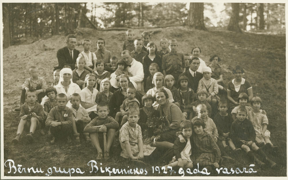 Latvijas Tuberkulozes apkarošanas biedrības Biķernieku mežā (Šmerļī) ierīkotās bērnu sanatorijas (vasaras kolonijas) bērni un darbinieki. Grupas foto. (Tagad Brīvības gatvē 384A atrodas Rīgas sanatorijas internātpamatskola).