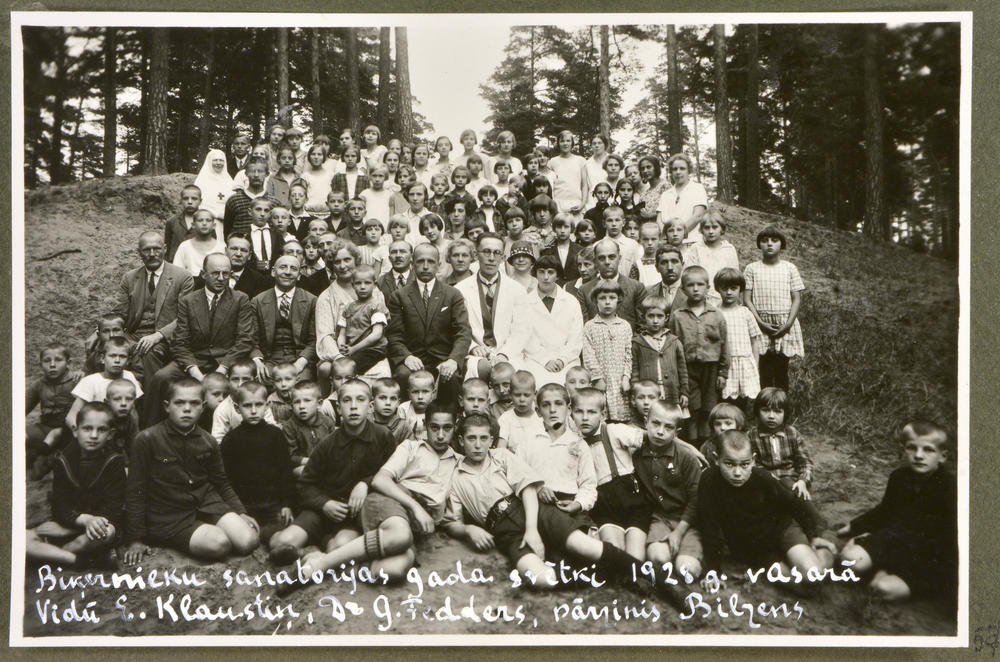 Latvijas Tuberkulozes apkarošanas biedrības Biķernieku mežā (Šmerļī) ierīkotās bērnu sanatorijas (vasaras kolonijas) bērni, darbinieki un viesi svētkos. Grupas foto. 2. rinda centrā Latvijas Tuberkulozes apkarošanas biedrības priekšsēdētāja Elza Klaustiņa ar bērnu klēpī, ārsts Gerhards Feders, sanatorijas pārzinis Bilzens. (Tagad Brīvības gatvē 384A atrodas Rīgas sanatorijas internātpamatskola).