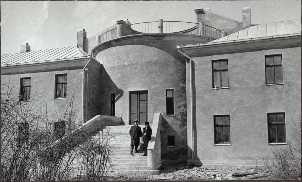 Skats uz Latvijas Tuberkulozes apkarošanas biedrības 1927. gadā Iļķenes muižā atklātās bērnu sanatorijas "Gauja" parādes ieeju. Uz kāpnēm stāv