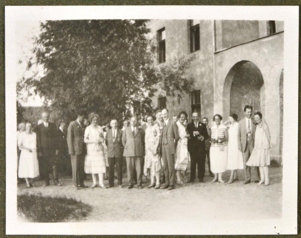 Viesi pie Latvijas Tuberkulozes apkarošanas biedrības 1927. gadā Iļķenes muižā ierīkotās bērnu sanatorijas "Gauja" ēkas. No kreisās: 4. Latvijas Tuberkulozes apkarošanas biedrības priekšsēdētāja Elza Klaustiņa?