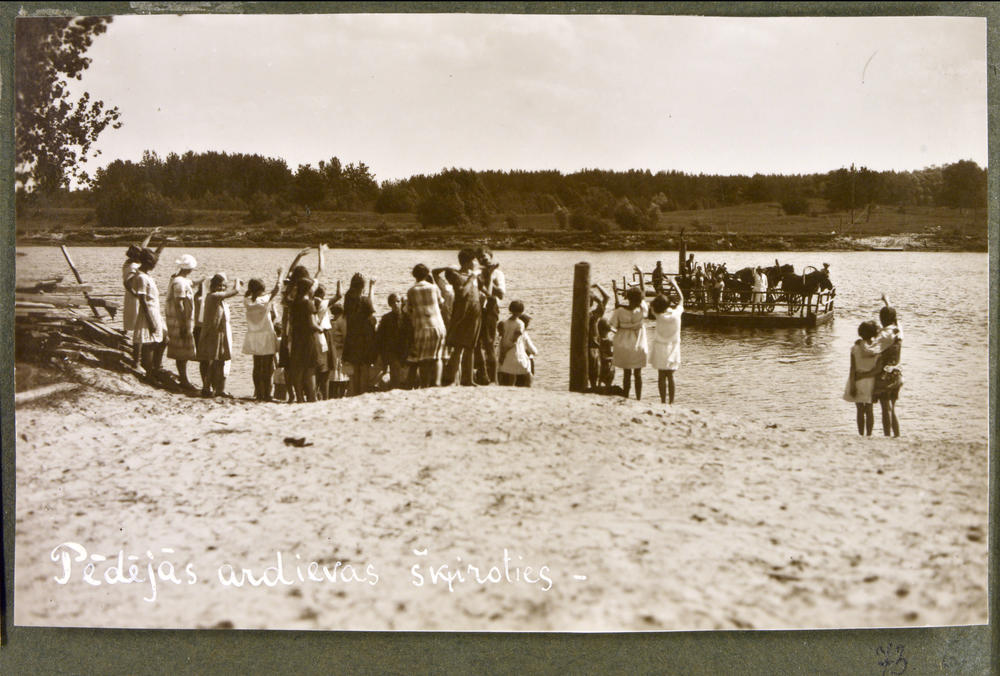 Latvijas Tuberkulozes apkarošanas biedrības bērnu sanatorijas "Gauja" Iļķenes muižā bērnu grupa upes krastā pavada viesus, kas stāv uz upē peldoša plosta (prāmis?).