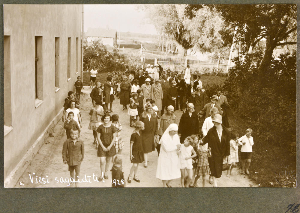 Latvijas Tuberkulozes apkarošanas biedrības bērnu sanatorijas "Gauja" bērni ar viesiem pie sanatorijas, kas atradās uz Iļķenes muižas kungu nama pamatiem celtajā ēkā.