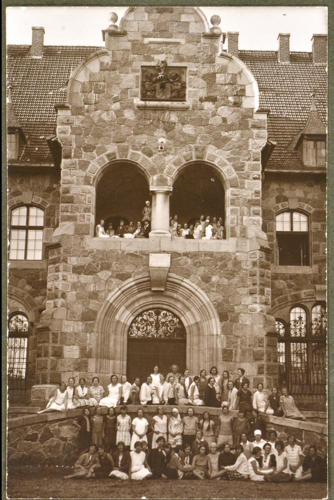 Latvijas Tuberkulozes apkarošanas biedrības ar Izglītības ministrijas palīdzību 1927. gadā Cesvaines pilī ierīkotās vasaras kolonijas audzēknes pie pils ēkas.