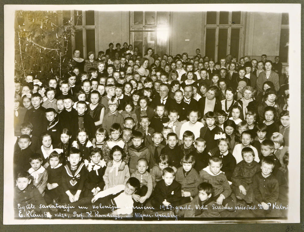 Latvijas Tuberkulozes apkarošanas biedrības rīkotā eglīte koloniju un sanatoriju bērniem. Grupas foto. 5. rindā centrā ārsts, Latvijas Republikas Saeimas priekšsēdētājs Pauls Kalniņš, no labās 5. profesors Kārlis Kundziņš, 4. operdziedātāja Malvīne Vīgnere-Grīnberga. Priekšpēdējā rindā Latvijas Tuberkulozes Apkarošanas biedrības priekšsēdētāja Elza Klaustiņa.