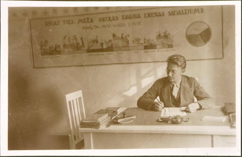 Latvijas Tuberkulozes apkarošanas biedrības 1928. gadā Biķernieku mežā (Šmerļī) bērnu sanatorijas telpās ierīkotās Rīgas pilsētas Meža skolas pārzinis Velmers pie rakstāmgalda. (Vidzemes šosejā 117, tagad Brīvības gatvē 384A atrodas Rīgas sanatorijas internātpamatskola).