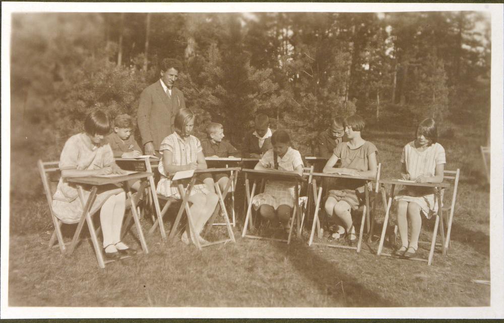 Latvijas Tuberkulozes apkarošanas biedrības 1928. gadā Biķernieku mežā (Šmerļī) bērnu sanatorijas telpās ierīkotās Rīgas pilsētas Meža skolas nodarbības brīvā dabā. (Vidzemes šosejā 117, tagad Brīvības gatvē 384A atrodas Rīgas sanatorijas internātpamatskola).