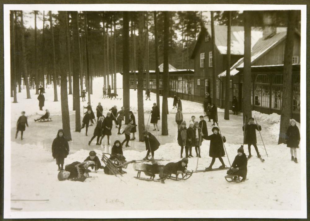 Latvijas Tuberkulozes apkarošanas biedrības 1928. gadā Biķernieku mežā (Šmerļī) bērnu sanatorijas telpās ierīkotās Rīgas pilsētas Meža skolas audzēkņu ziemas sporta nodarbības. (Vidzemes šosejā 117, tagad Brīvības gatvē 384A atrodas Rīgas sanatorijas internātpamatskola).