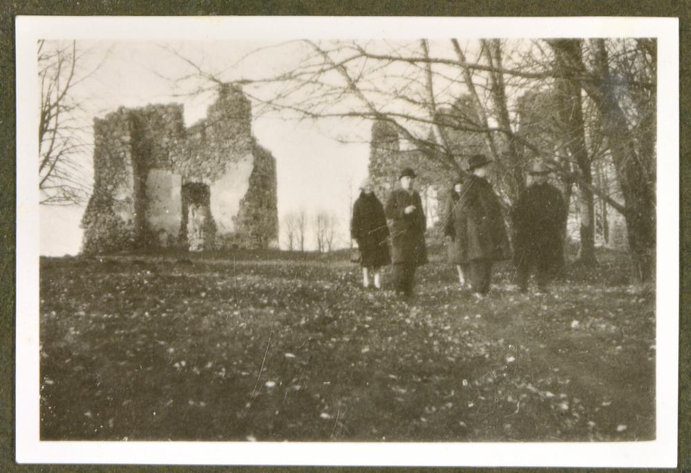 Cilvēku grupa pastaigas laikā pie senas akmens ēkas drupām.