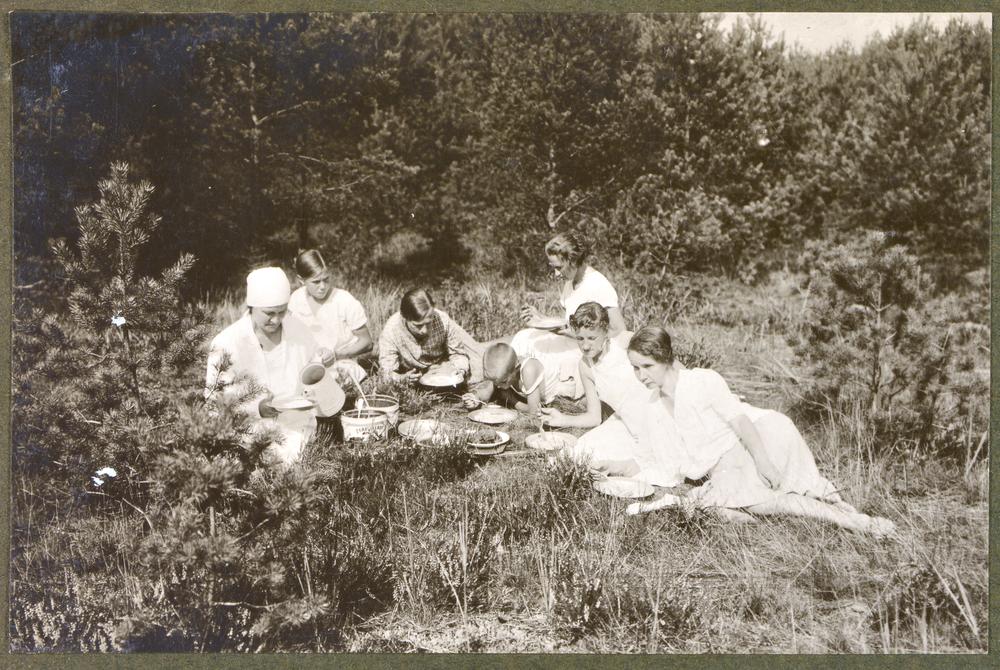 Kaulu tuberkulozes slimnieki Latvijas Tuberkulozes apkarošanas biedrības un Rīgas pilsētas Veselības nodaļas ierīkotajā apsauļošanās laukumā Biķernieku mežā. No rīta slimnieki brauca uz mežu, ārsta un medmāsu uzraudzībā sauļojās, ēda pusdienas un launagu.