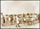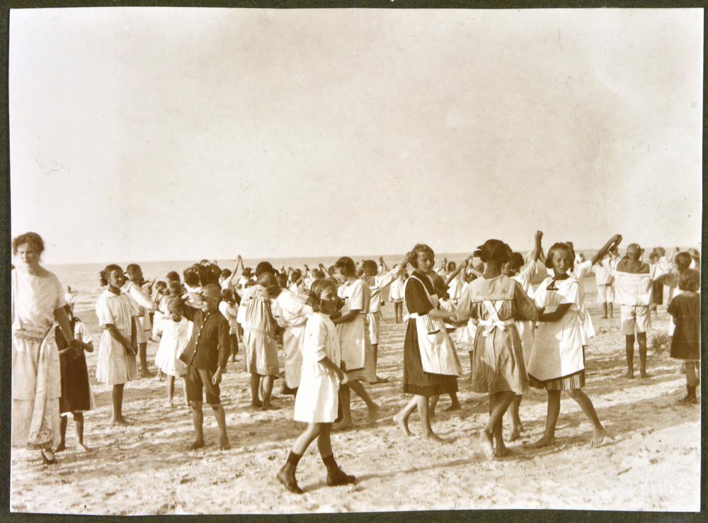 Latvijas Bērnu fonda komitejas vasaras kolonijas Dubultos bērni pludmalē pie jūras vingro.