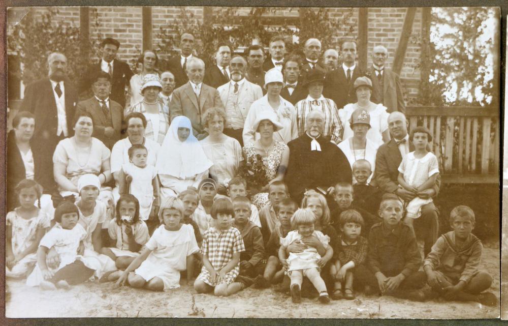 Latvijas Tuberkulozes apkarošanas biedrības Jelgavas nodaļas pirmā Latvijas Valsts prezidenta vārdā nosauktās bērnu sanatorijas (kolonijas) atklāšana Kalna Lediņos. Grupas foto. Centrā Latvijas Tuberkulozes apkarošanas biedrības priekšsēdētāja Elza Klaustiņa.
