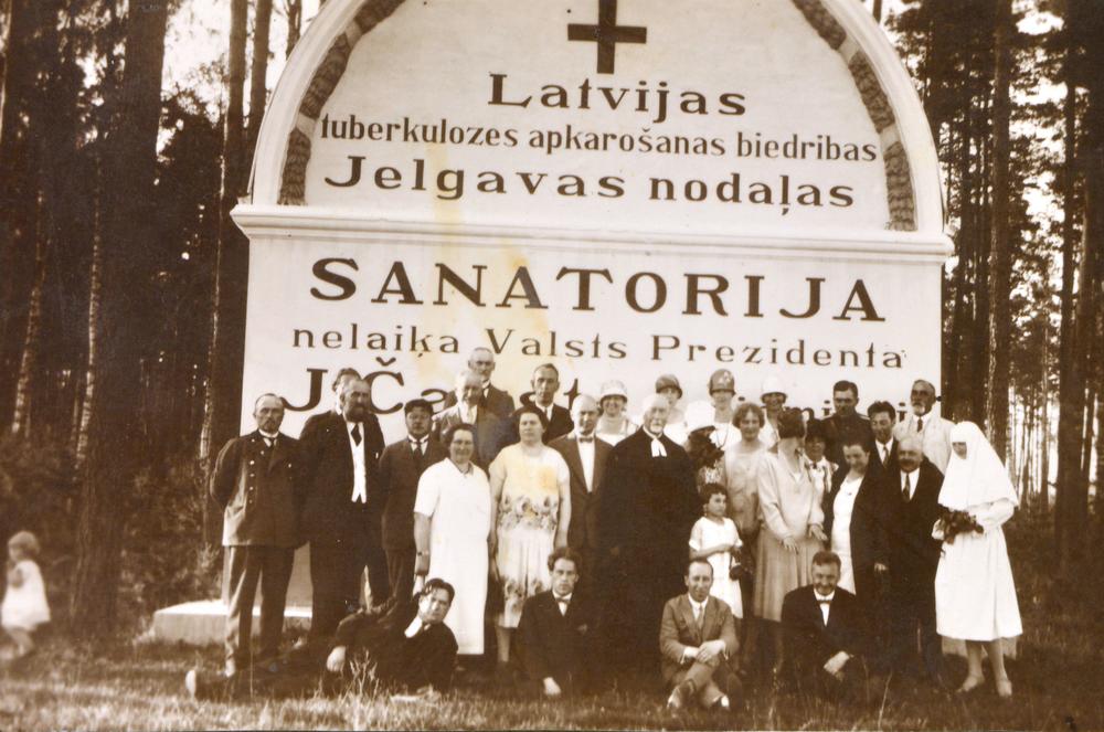 Latvijas Tuberkulozes apkarošanas biedrības Jelgavas nodaļas pirmā Latvijas Valsts prezidenta vārdā nosauktās bērnu sanatorijas (kolonijas) atklāšana Kalna Lediņos. Grupas foto.