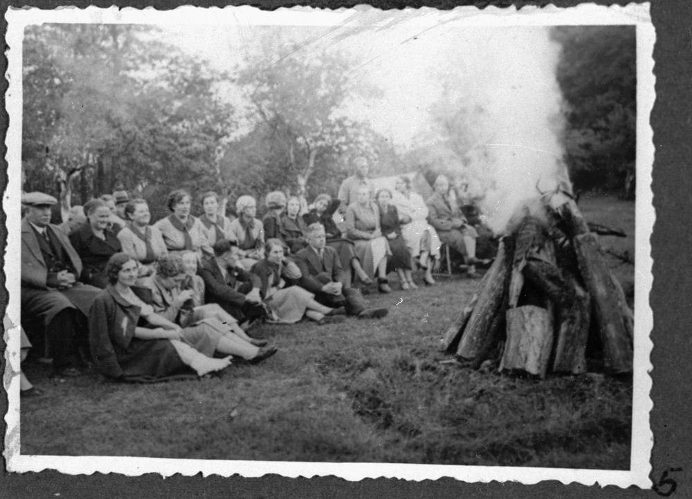 Pirmie Latvijas mazpulku vadītāju kursi, attēlā redzami Rīgas mazpulku vadītāji vasaras nometnē vakara stundā pie lielā ugunskura Saules dārzā pie Ķīšezera.