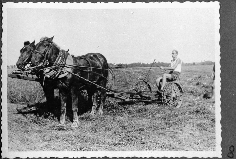 Pirmā mazpulku vasaras darba nometne, attēlā Rīgas ģimnāzijas mazpulku dalībnieks siena talkā.