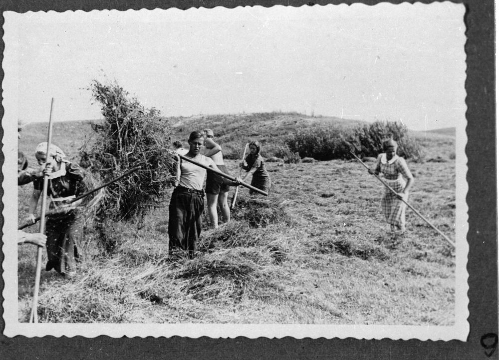Pirmā mazpulku vasaras darba nometne, attēlā Rīgas ģimnāzijas mazpulki siena talkā.
