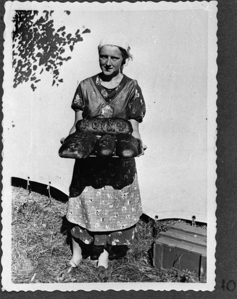 Pirmā mazpulku vasaras darba nometne, mazpulku dalībniece ar pašu ceptu maizi.