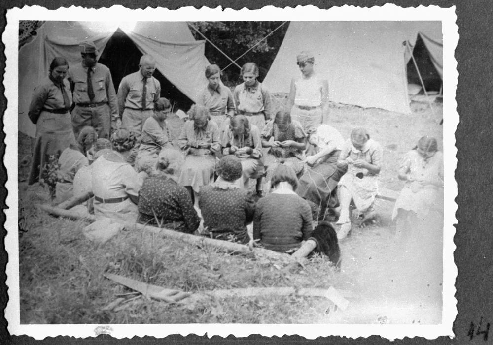 Pirmā mazpulku vasaras darba nometnē meitenes sacenšas adīšanā, atbraucēji vēro sacensību gaitu.