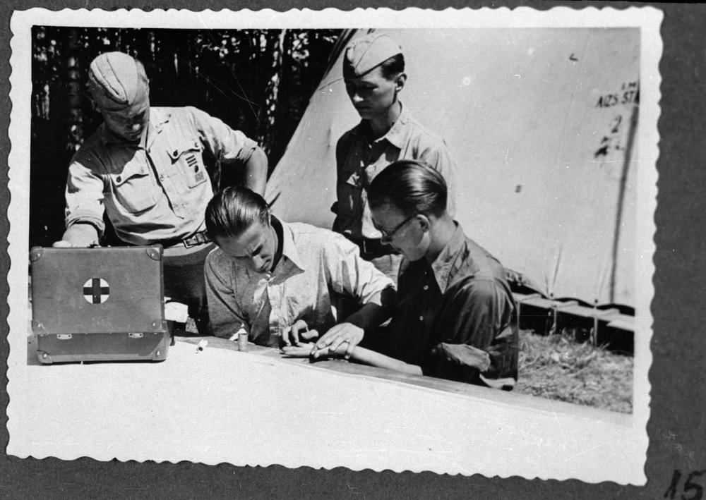 Pirmā mazpulku vasaras darba nometnē apmācības pirmās palīdzības sniegšanai ''cietušajam''.