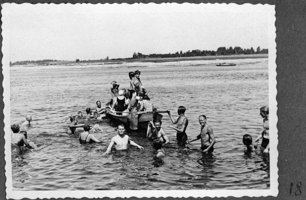 Ģimnāzijas mazpulki pirmajā vasaras darba nometnē mazpulku atpūtas laikā Daugavas ūdeņos.