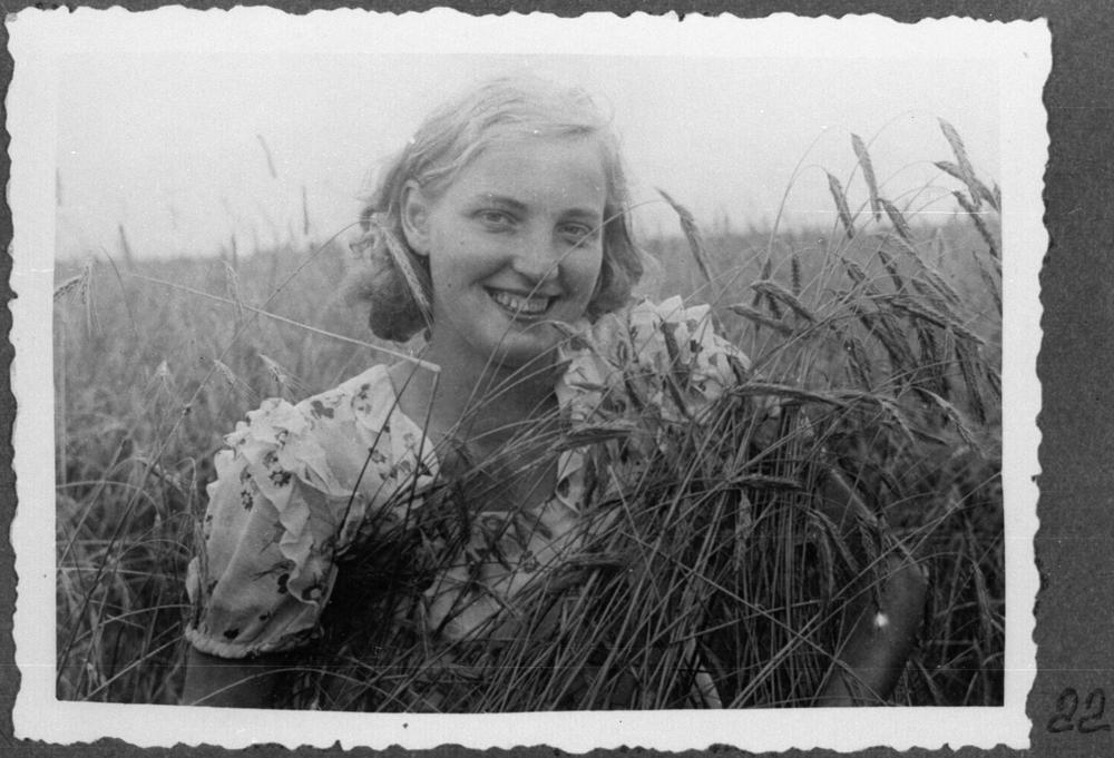 Otrā mazpulku vasaras darba nometnē Salas muižā mazpulka dalībniece rudzu druvā.