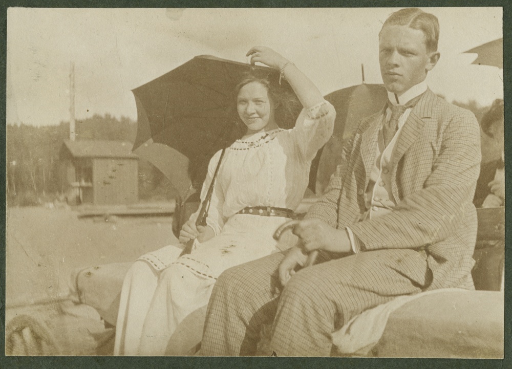 Jauna meitene ar saulessargu un puisis izbraukumā zirga pajūgā.