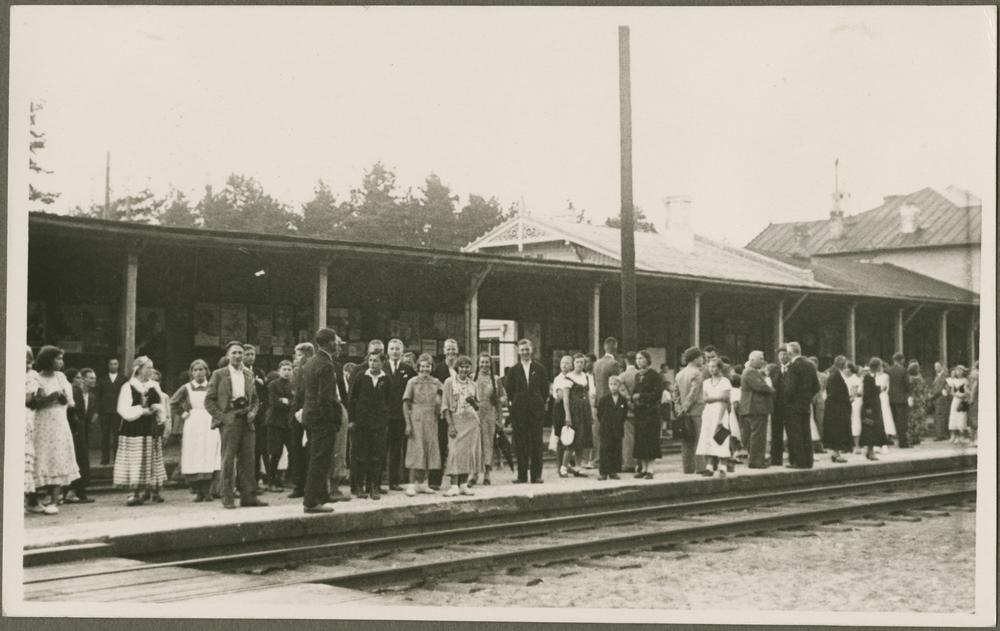 Baltijas valstu un Eiropas ziemeļvalstu Jaunatnes Sarkanā Krusta starptautiskās konferences dalībnieki izbraukuma laikā stacijā pie vilciena sliedēm.