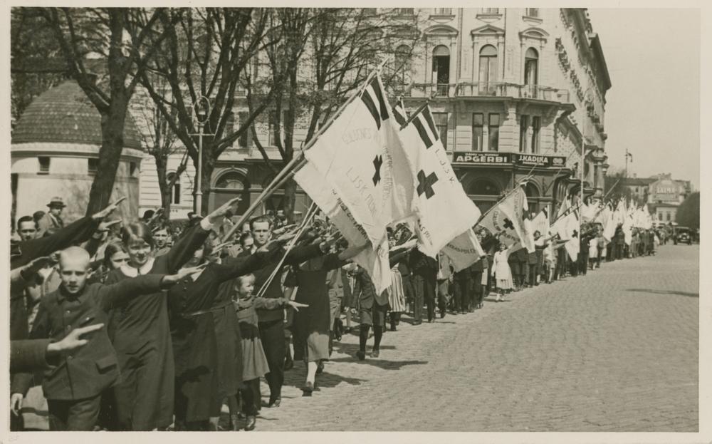 Latvijas Jaunatnes Sarkanā Krusta (LJSK) pulciņu delegātu konferences dalībnieki pie Brīvības pieminekļa.