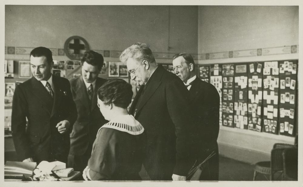 Latvijas Jaunatnes Sarkanā Krusta (LJSK) pulciņu delegātu konferences laikā ar izstādes ekspozīciju iepazīstas izglītības ministrs Augusts Tentelis (centrā).
