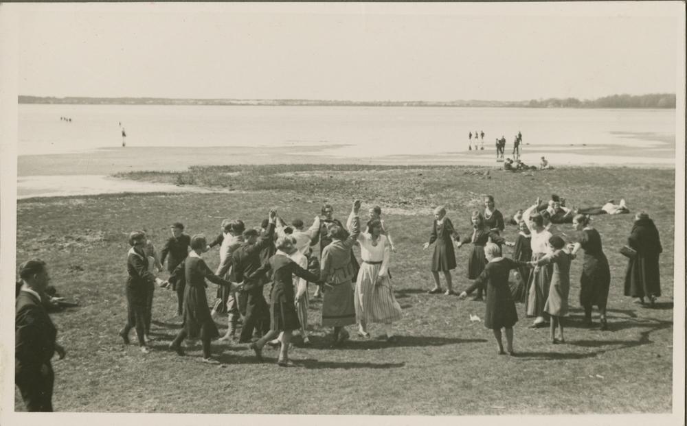 Baltijas valstu un Eiropas ziemeļvalstu Jaunatnes Sarkanā Krusta starptautiskās konferences dalībnieki tautiskās rotaļās ezera krastā Jaunciemā.