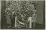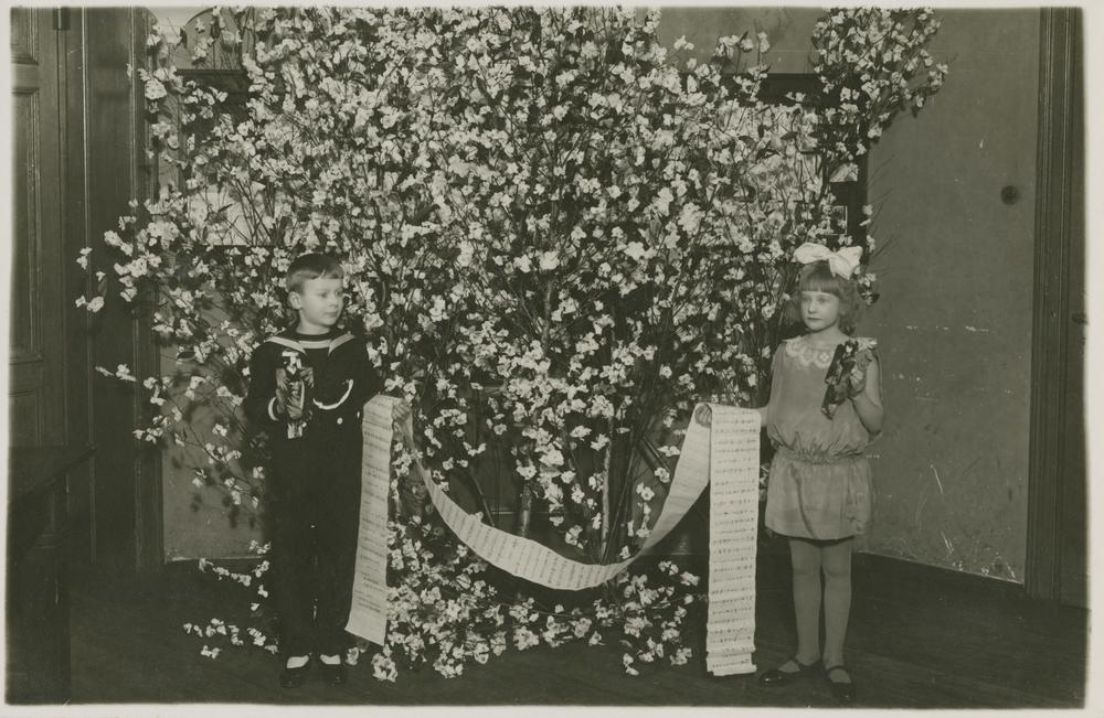 Zēns un meitene demonstrē Latvijas Jaunatnes Sarkanajam Krustam Japānas Jaunatnes Sarkanā Krusta dāvinātās lelles un vēstuli. Fonā vāze ar lieliem jasmīnu zariem.