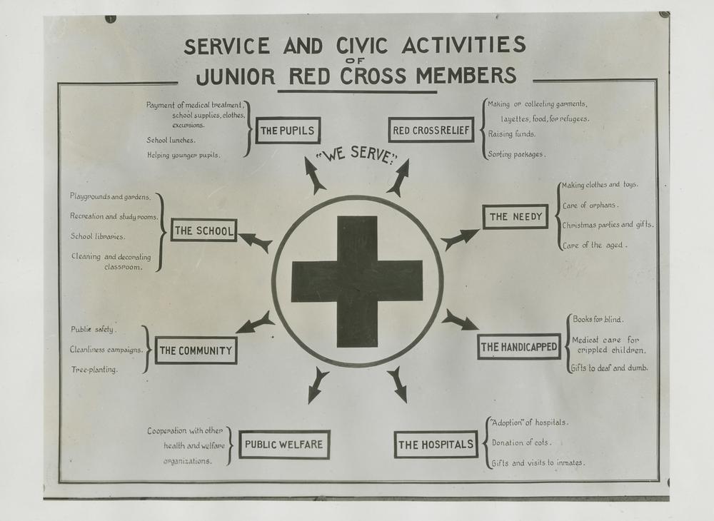 Starptautiskās Jaunatnes Sarkanā Krusta organizācijas biedru palīdzības un sabiedriskās darbības shēmas attēls ar tekstu angļu valodā.