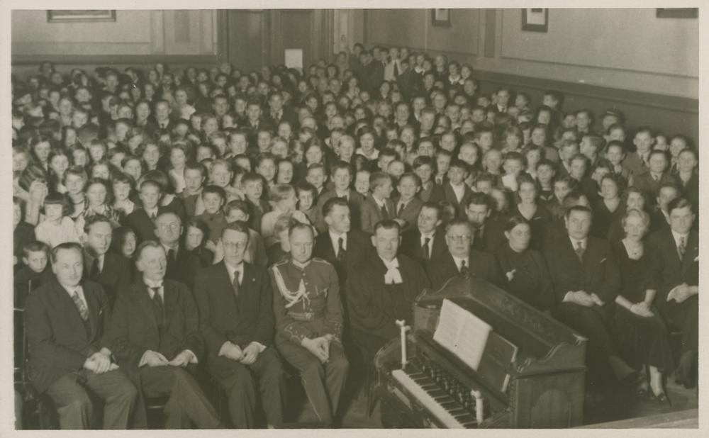 Latvijas Jaunatnes Sarkanā Krusta (LJSK) ganiem organizētās eglītes svinīgais pasākums zālē. LJSK rīkoja skolēniem, kas vasarā bija noslēguši līgumus ar Rīgas pilsētas Sabiedriskās palīdzības komitejas jaunatnes vasaras darba apgādi, eglīti ar priekšnesumiem un mielastu.