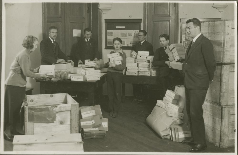 Latvijas Jaunatnes Sarkanā Krusta organizācijas pulciņu biedri sagatavo Amerikas Savienoto Valstu (ASV) Sarkanā Krusta atsūtīto dāvanu kārbiņas nosūtīšanai.