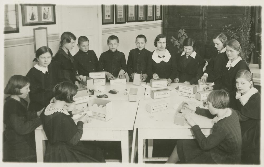 Latvijas Jaunatnes Sarkanā Krusta veselības kopšanas punktā pulciņa biedri sagatavo dāvanu kārbiņas trūcīgajiem bērniem.