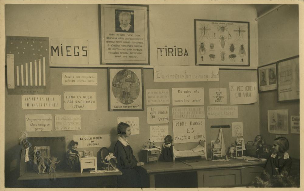 Skolnieces pie Rīgas Valsts parauga pamatskolas Latvijas Jaunatnes Sarkanā Krusta pulciņa veselības kopšanas tēmai veltītās izstādes stenda. Izstādē redzamas lelles, leļļu mēbeles, uzraksti "Miegs", "Tīrība", "Pirms ēšanas es mazgāju rokas" un citi eksponāti.