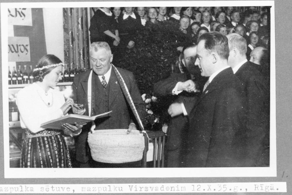 Tukuma mazpulku organizācijas dalībnieki dāvina Latvijas Valsts un Ministru prezidentam Kārlim Ulmanim (centrā) sētuvi mazpulku darba izstādes laikā, kura tik rīkota no 11. līdz 18. oktobrim Rīgas Latviešu biedrības namā.