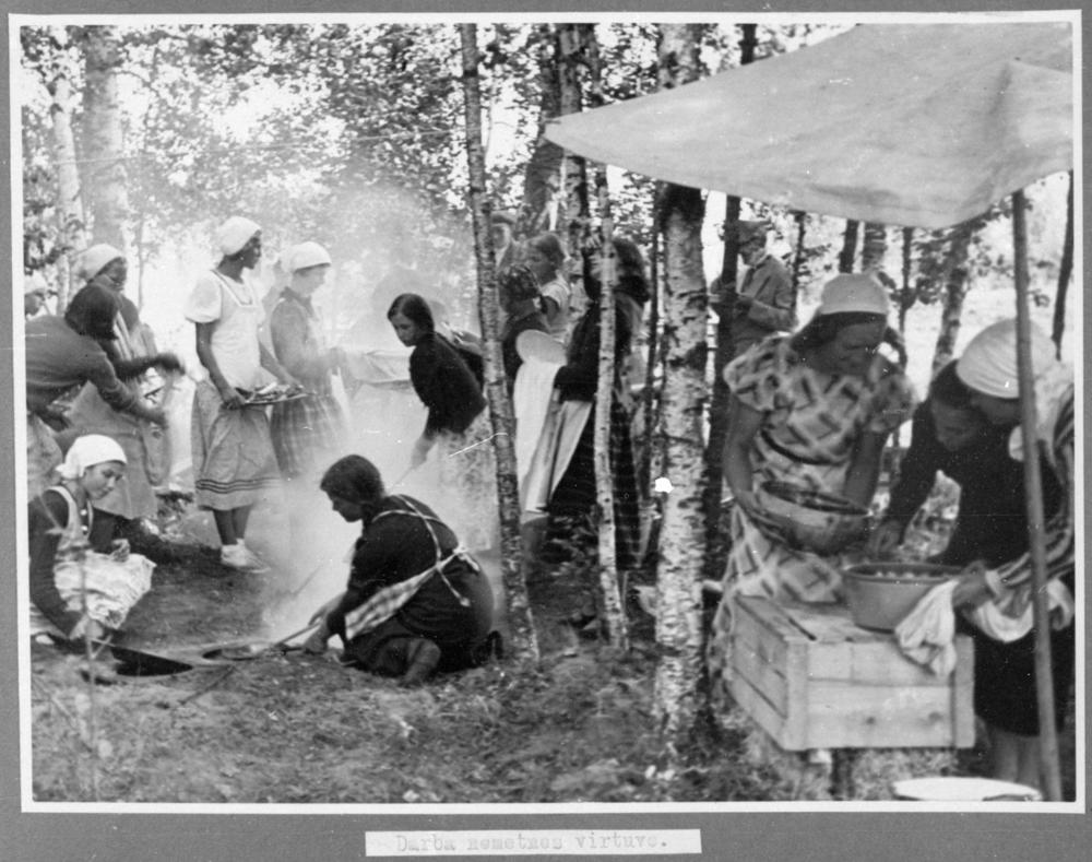 Tukuma mazpulka organizācijas dalībnieki nometnes lauku virtuvē Smārdes pagasta Šķiltriteros.