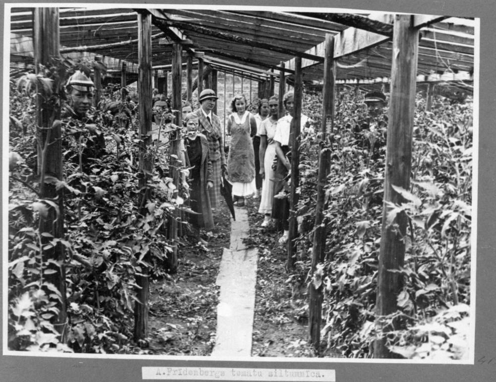 Tukuma mazpulka organizācijas dalībnieki zemnieka M. A. Frīdenberga tomātu siltumnīcā, nometnes laikā Tukuma apriņķī.
